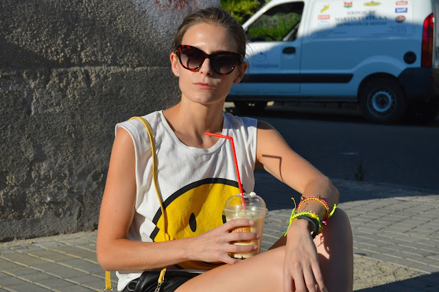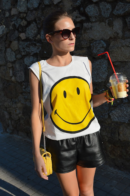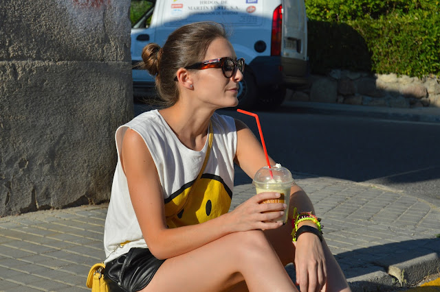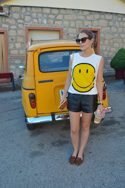 it’s good to take a break after a long day of work, today I’m wearing my smiley t-shirt which I combined with yellow, black and my leopard flats, bringing with me another summer basic my favourite banana milkshake. You can also see other outfit where I’m wearing the same t-shirt here. I feel comfortable wearing these kind of outfits where a final touch is below on leopard flats. Peace and Love to all you, happy thursday and keep strong Galicia!! 🙂