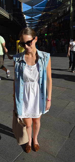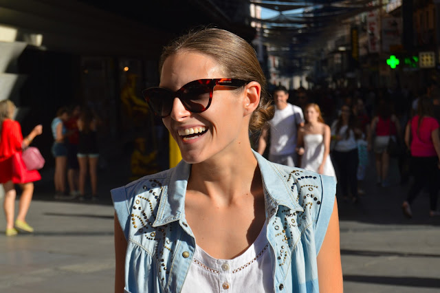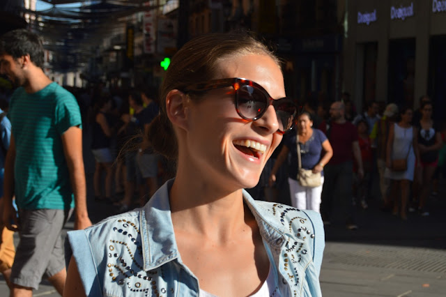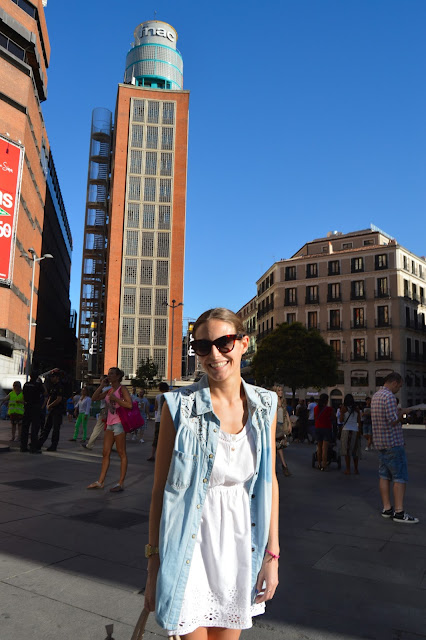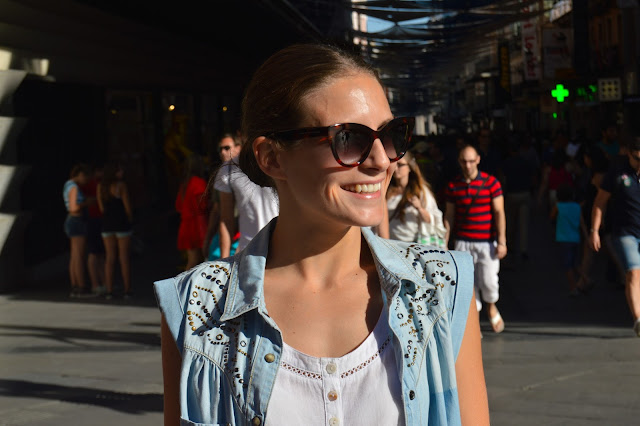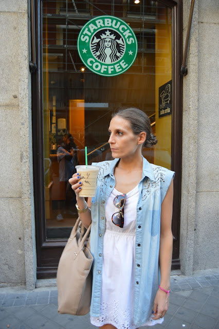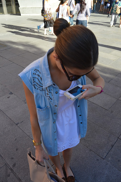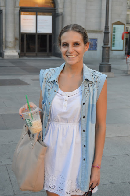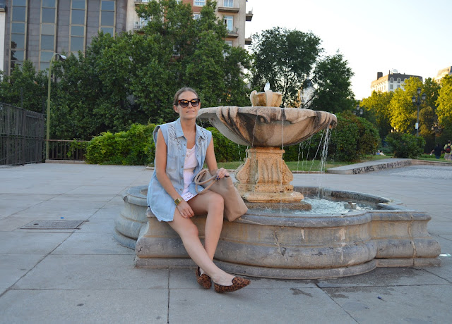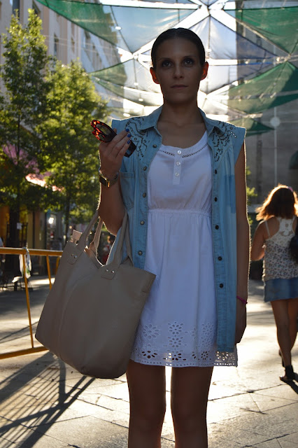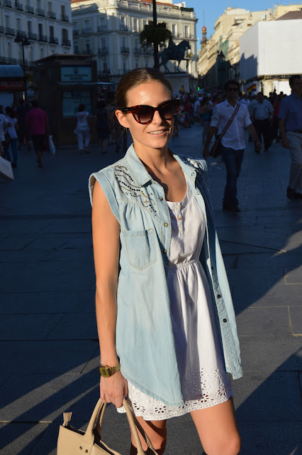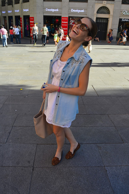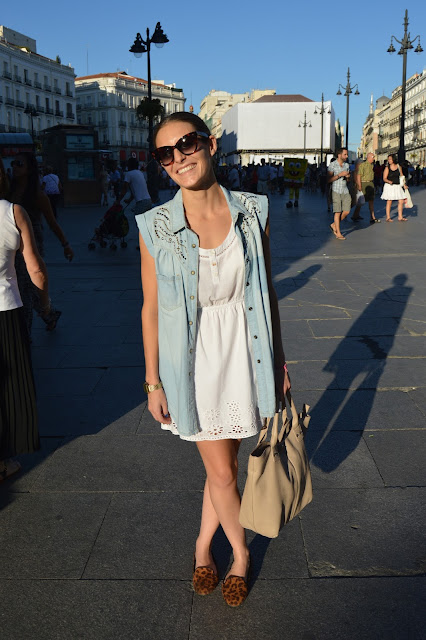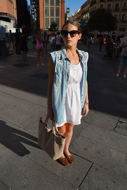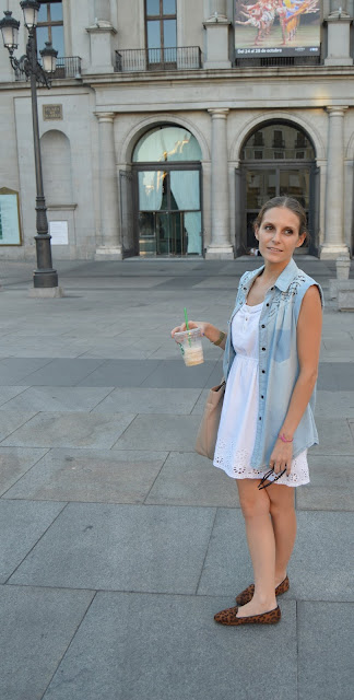 Here, you have a big post from Madrid. We went to down town to take some pics and make some sales shopping while we were walking through its streets and drinking iced coffee. We went to San Ginés street where there is an old tiny library that I have visited a thousand times before looking for some books. I love to read a good book so I used to take my time to find one. We were lucky because its bookseller invited us to sit down inside its tiny library which sells books at the stand on the street, that’s the reason why we were lucky to come in and sitting down on its old and vintage chair. Today, I’m wearing my old white dress which I combined with this blue shirt that you can also see another outfit where I’m wearing this white drees here. I putted up my hair on a classic down bun complementing this outfit with leopard and beige accessories. Do you like the result?