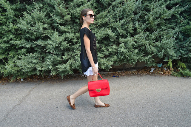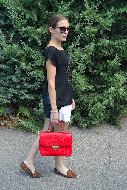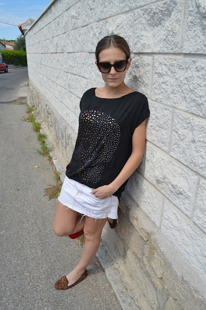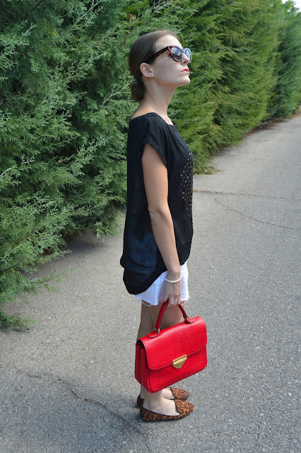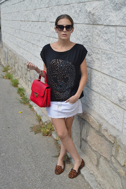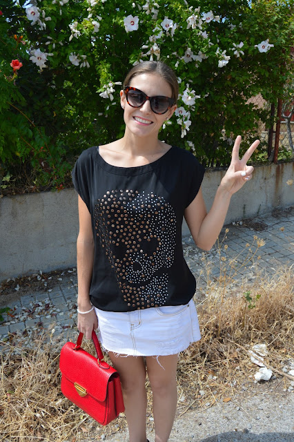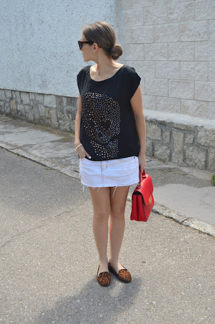 Do you have plans for this weekend? Here, I leave you an easy and chic post that you can wear it these days where classics are the key. Black, white and red are the master colours which I combined gold on my purse and silver on my earrings as the tee skull is on it. I put up my hair on a classic bun which is adding an extra chic look. Do you like it? thanks for your comments. 🙂