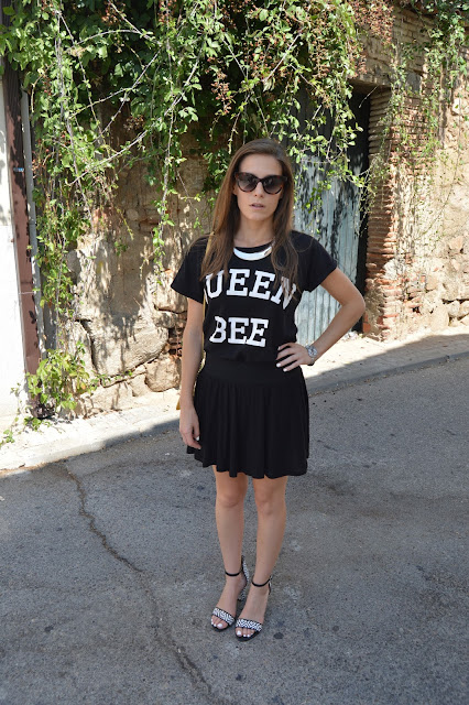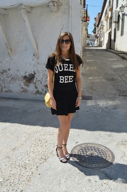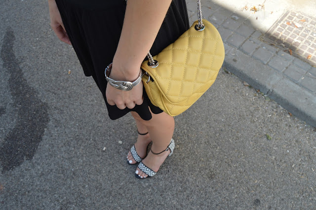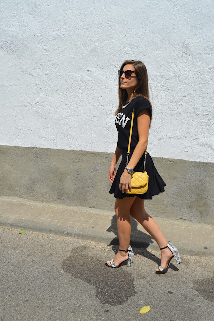 Hoy elegí un look total black con un toque amarillo en mi bolso, llevando esta camiseta nueva de Primark. También añadí el último toque gracioso y elegante en mis zapatos, me encantan. La moda es creación, siéntete libre de crear tu propio estilo. Sed felices y feliz martes! Os gusta esta combinación? gracias por vuestros comentarios.
