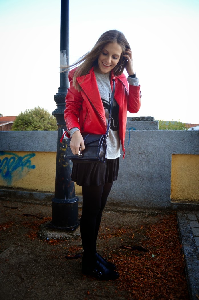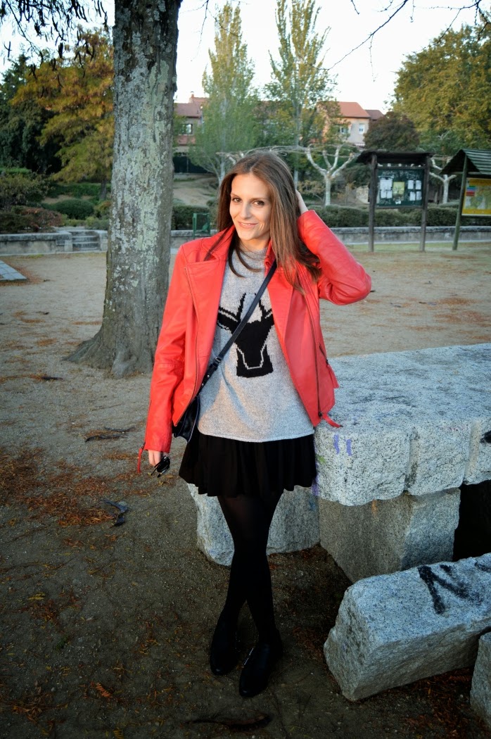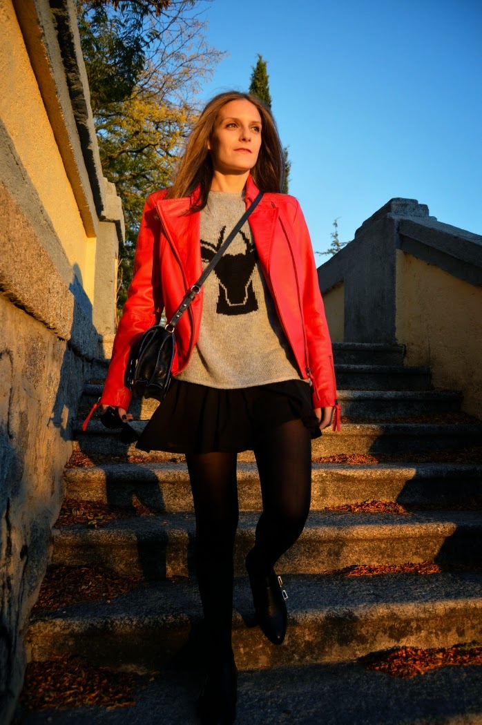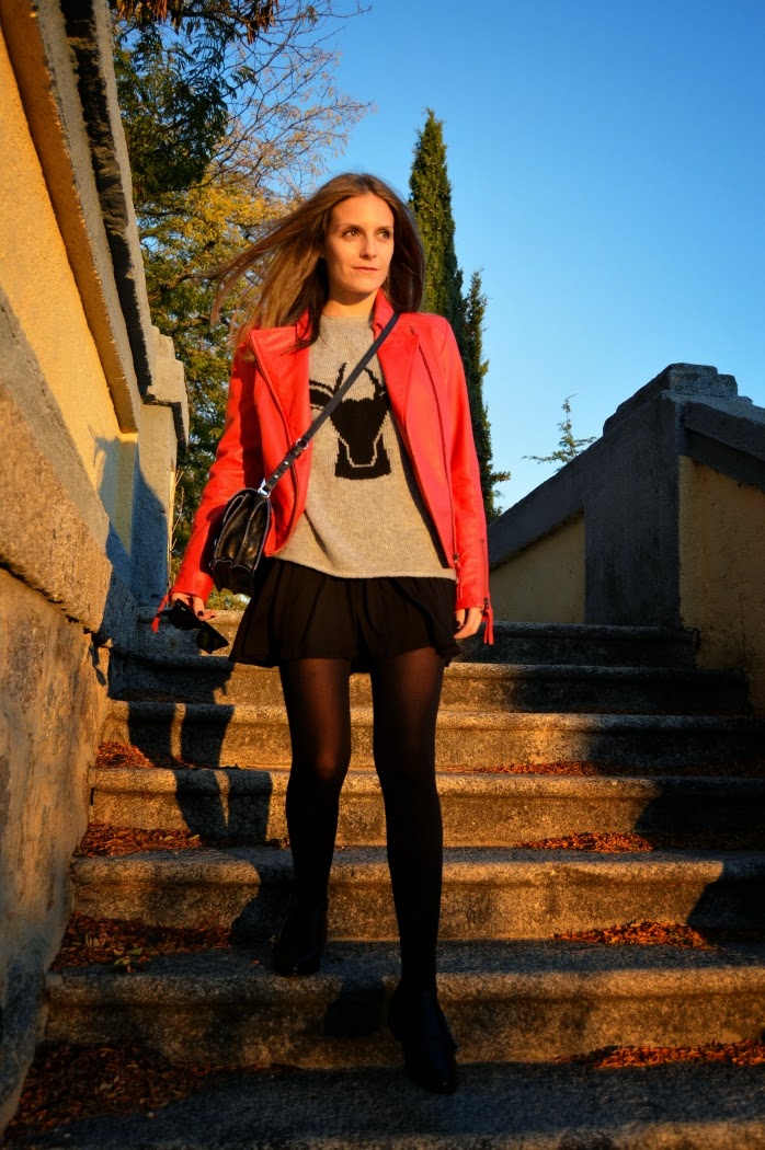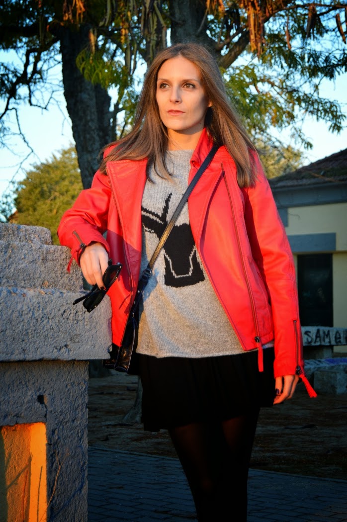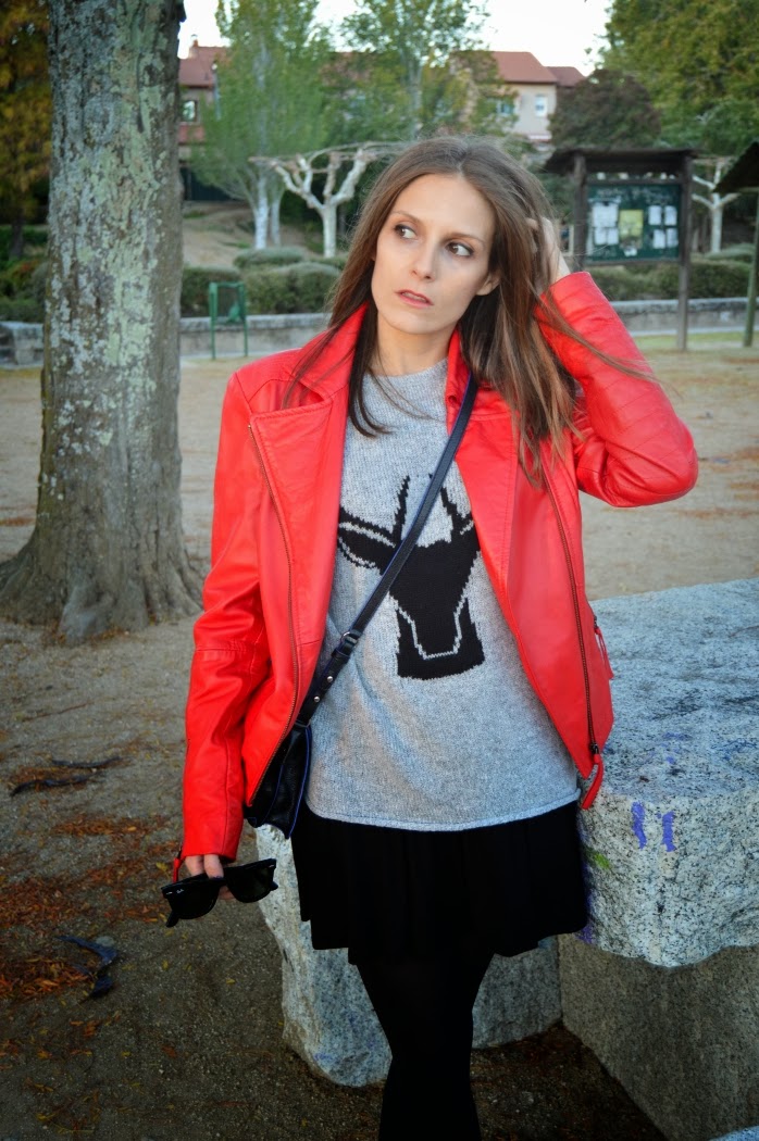 This jacket reminds me a lot of Michael Jackson’s Thriller videoclip. I wore this combo on sunday, we took these pics before we went to the theatre. Just a pop of red on my look, wearing a classic black skirt with this black deer on my grey sweater.